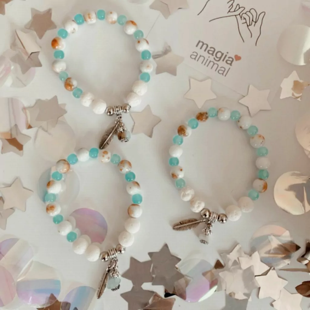 Hermosas pulseras elásticas con piedra volcánica, cuentas aqcua y tierra. Con dije de pluma y cristal Aguamarina. Una verdadera belleza, cómoda y conectada con el agua.