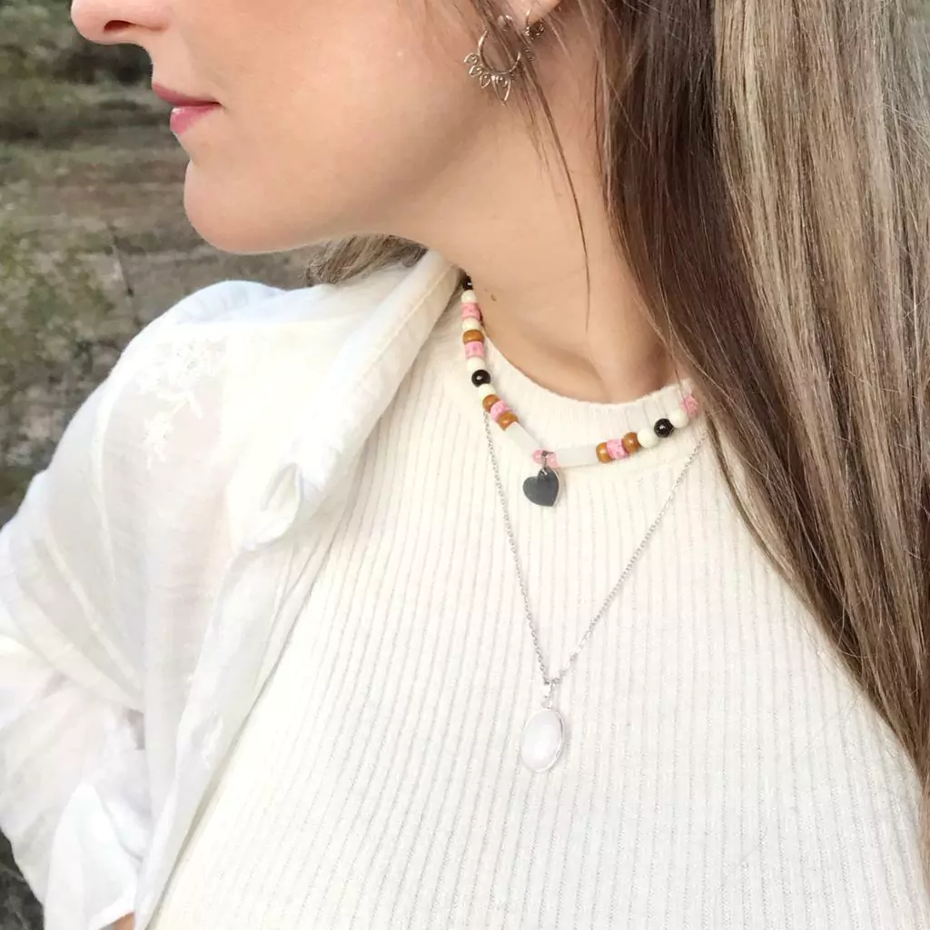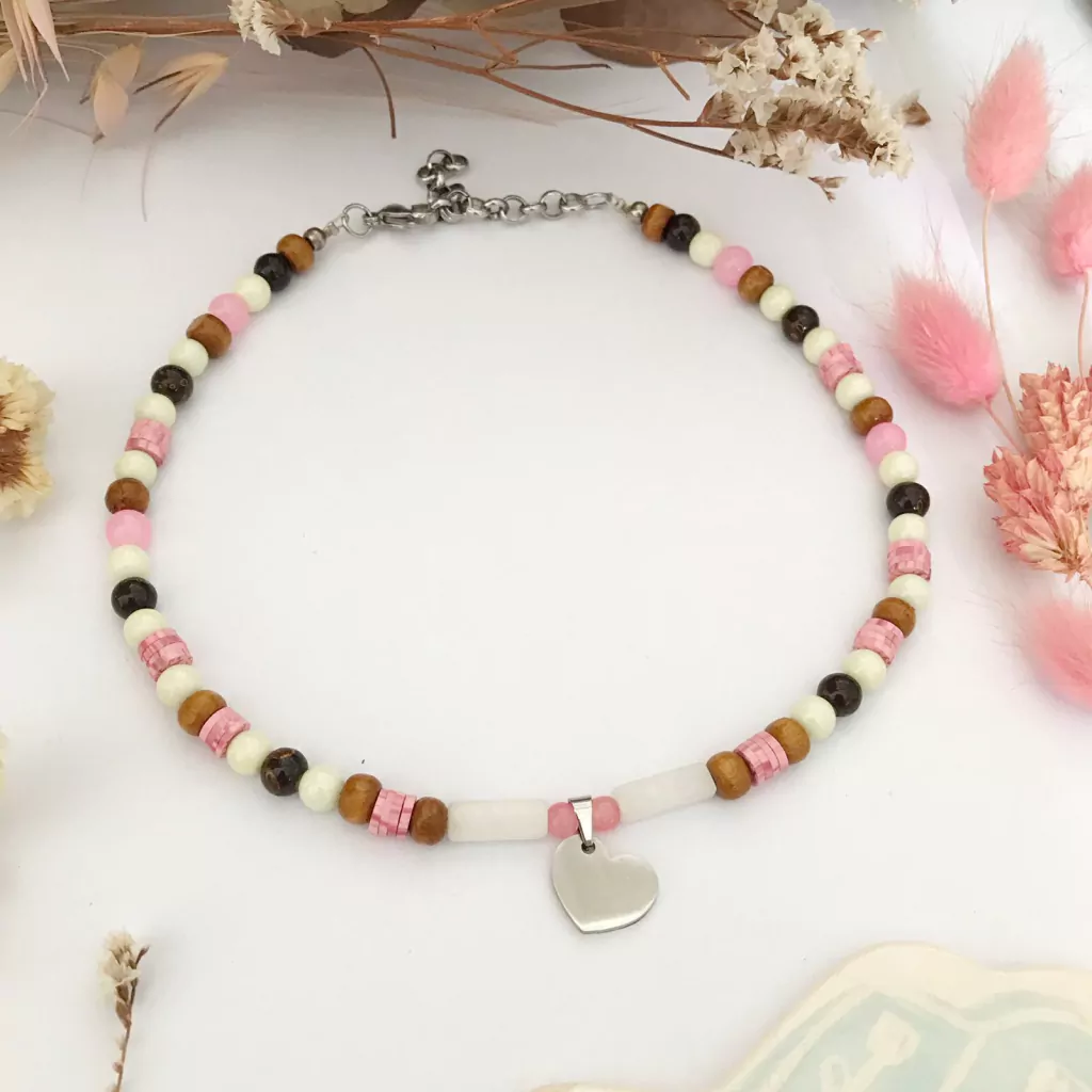 Precioso choker con cuarzo blanco cilíndrico con dije de corazón de acero quirúrgico en el centro y cuentas de madera, vidrio, goma y acrílico. La cadena de alargue, al igual que el mosquetón de cierre son de acero quirúrgico.