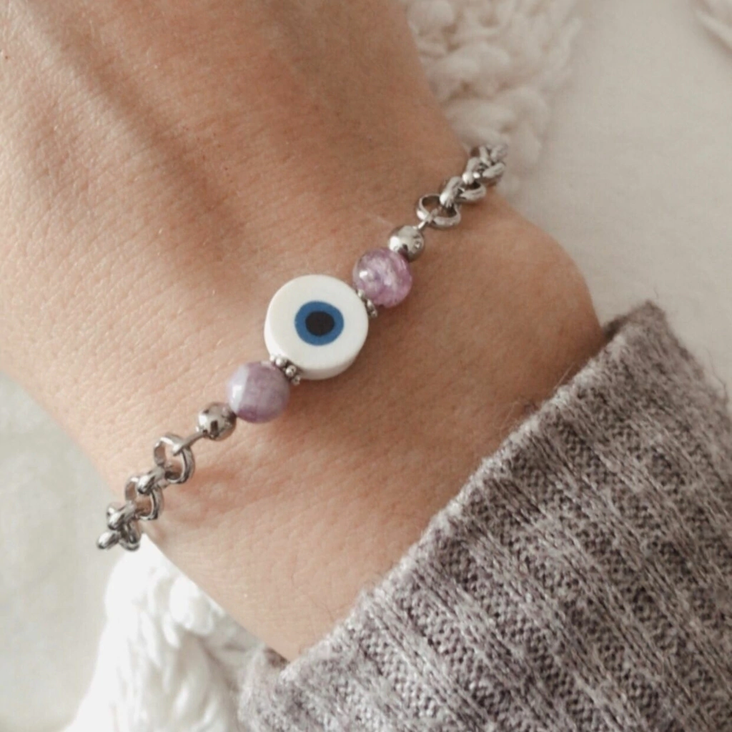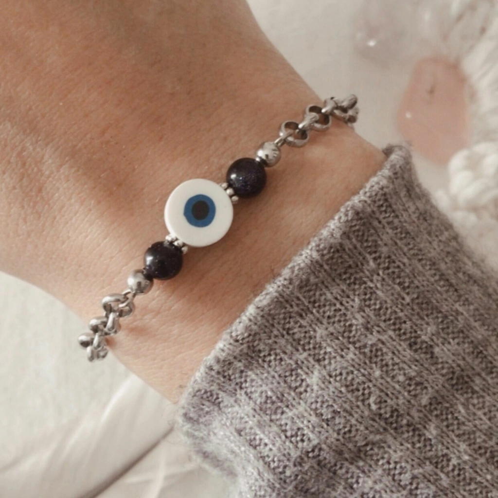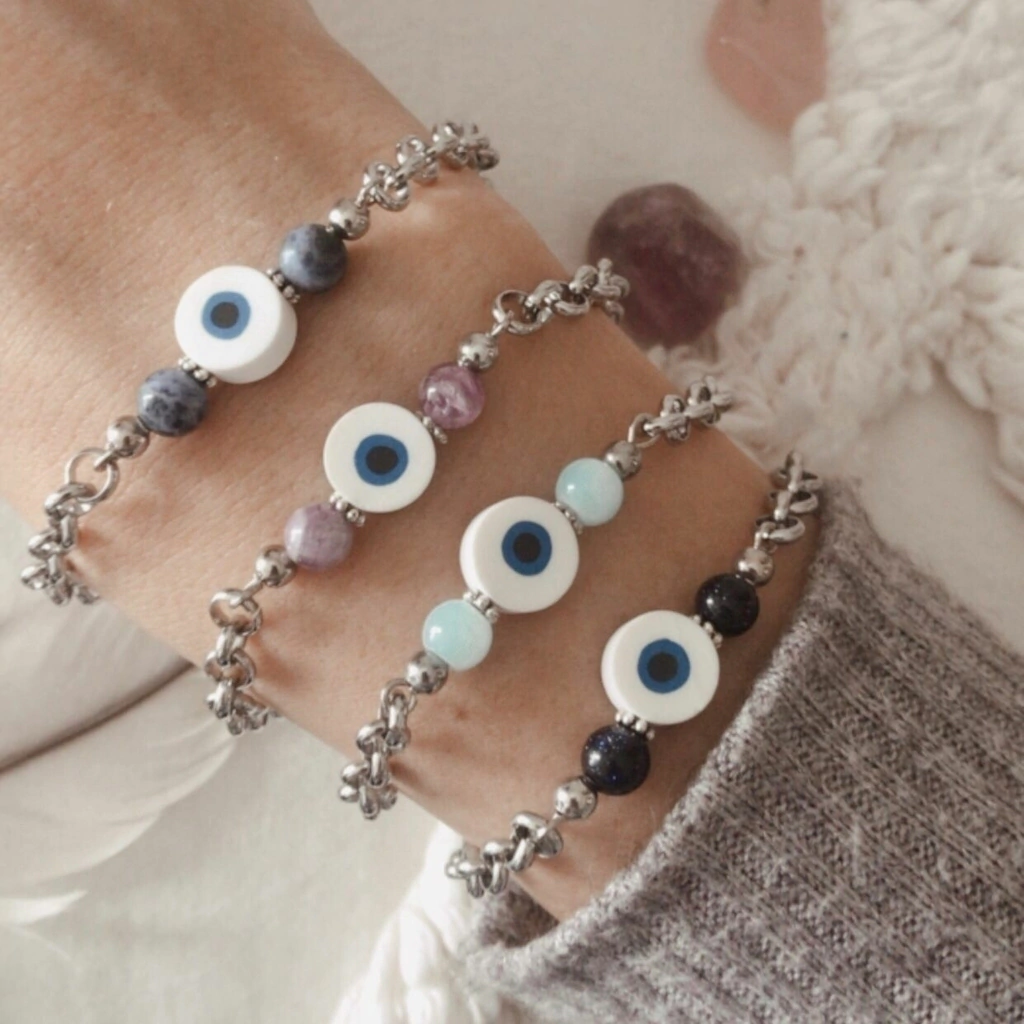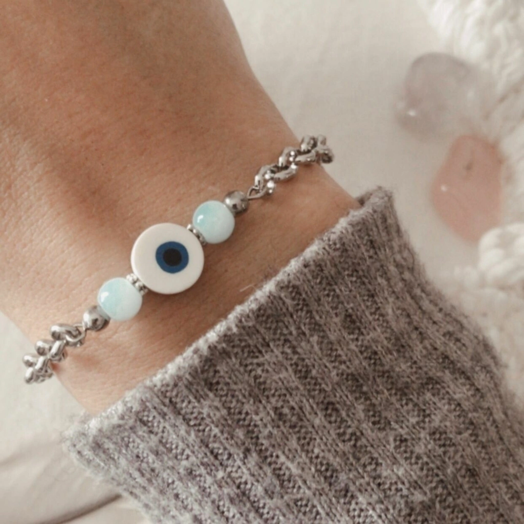 Hermosa pulsera de acero quirúrgico, con ojito turco fimo y dos cristales a su aleredor rolados y hermosos.