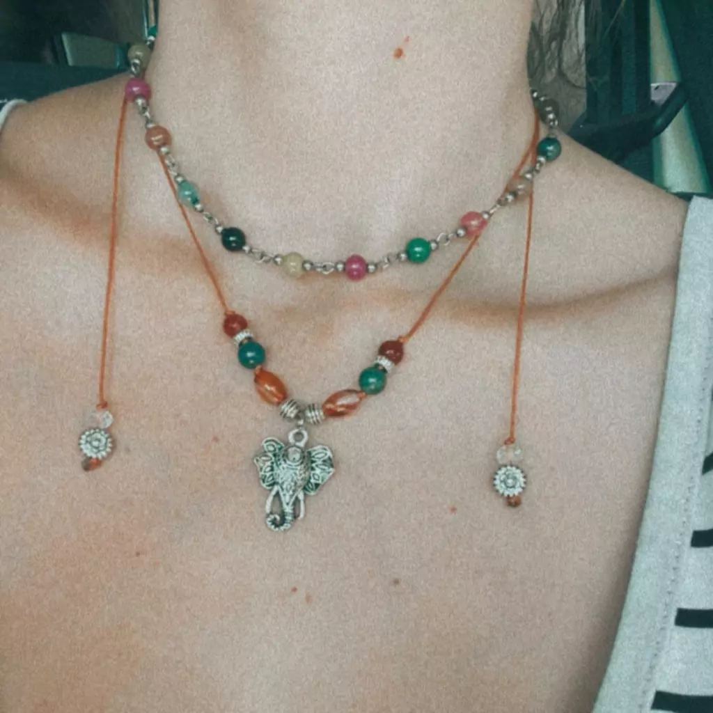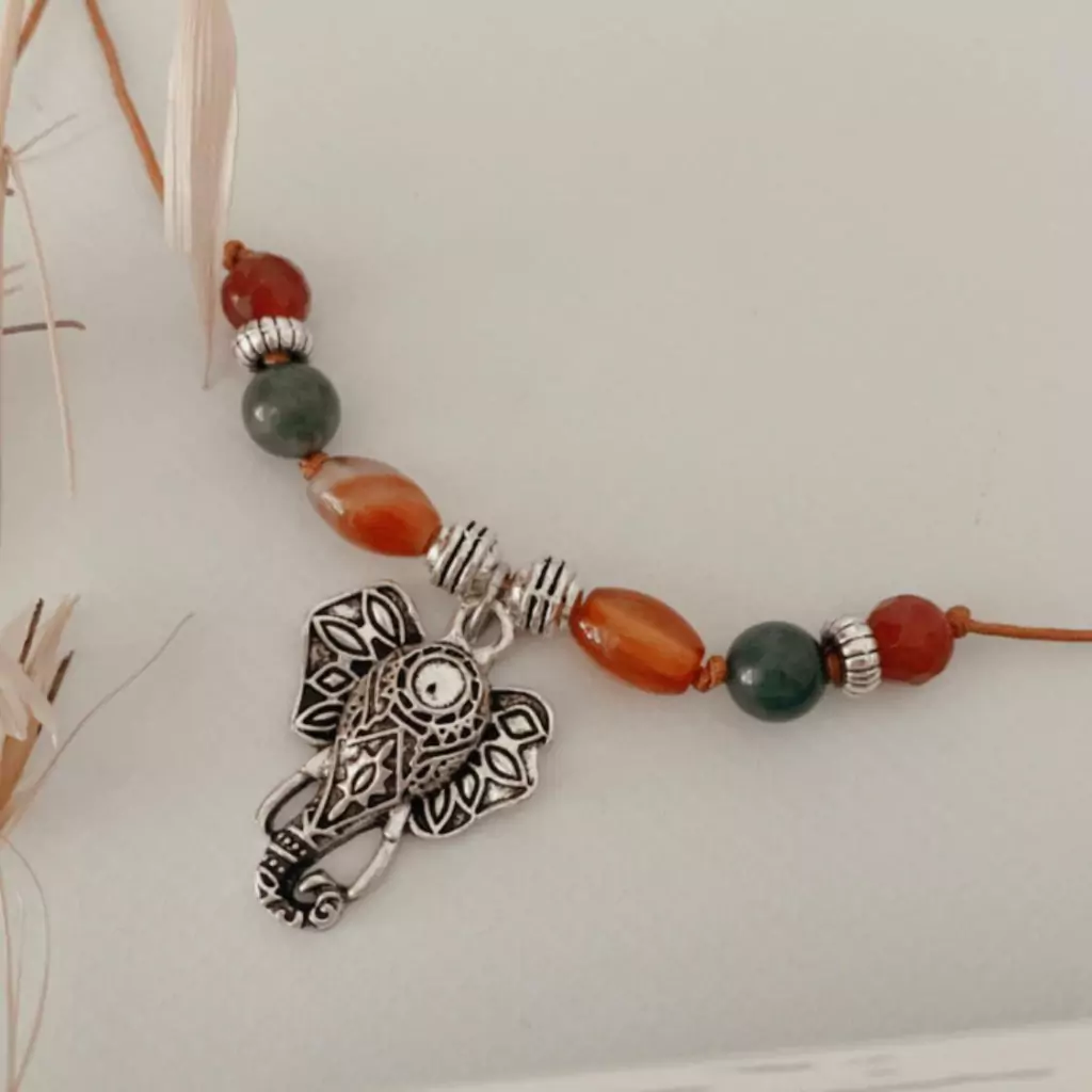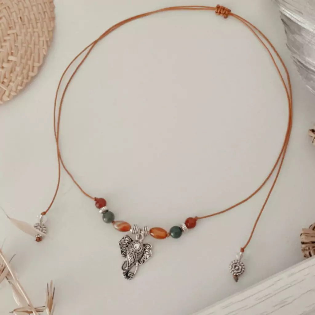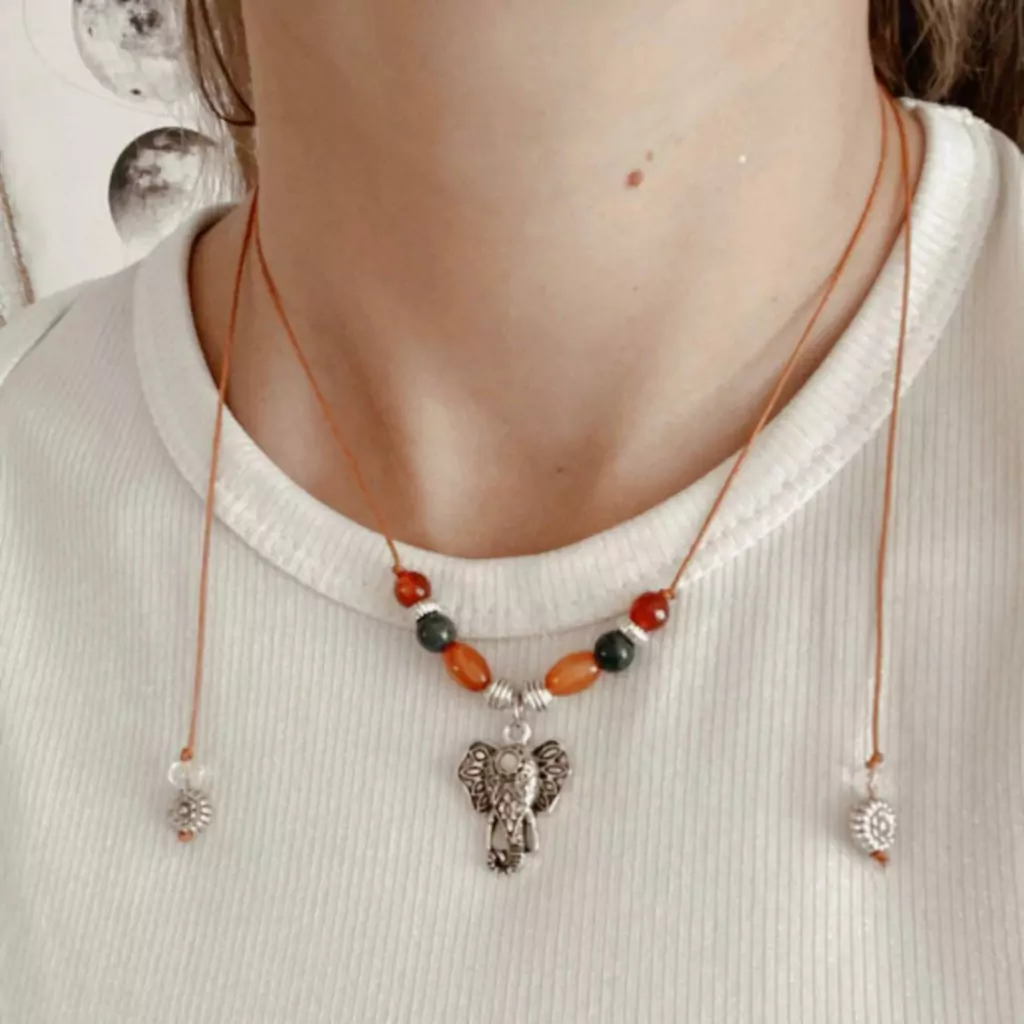 Hermoso collar con hilo sedoso chino en color caramelo, con cristales de ágata y dije de elefante labrado de fundición. Termina con dos pasadores de fundición divinos que le dan el toque, además tiene cristales facetados y se puede usar en diferentes largos. Su método de cierre es con sistema de ajuste con nudo macramé, que con este tipo de hilo no se corre, no se sale y no molesta.