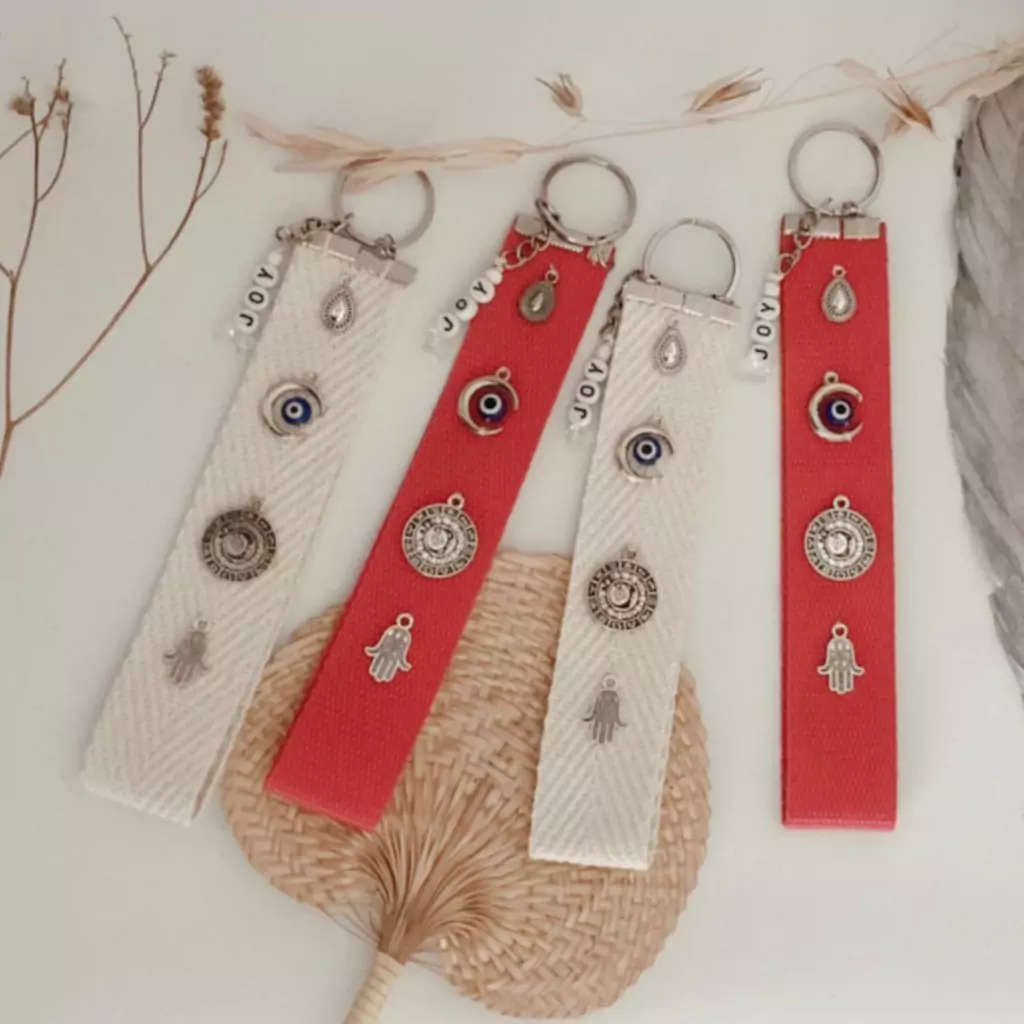 Hermoso llavero de tiras de algodón reforzadas con dijes protectores bordados y palabras con cristales en sus extremos.