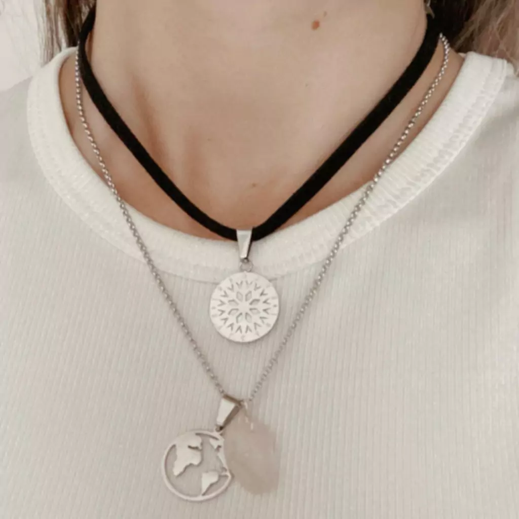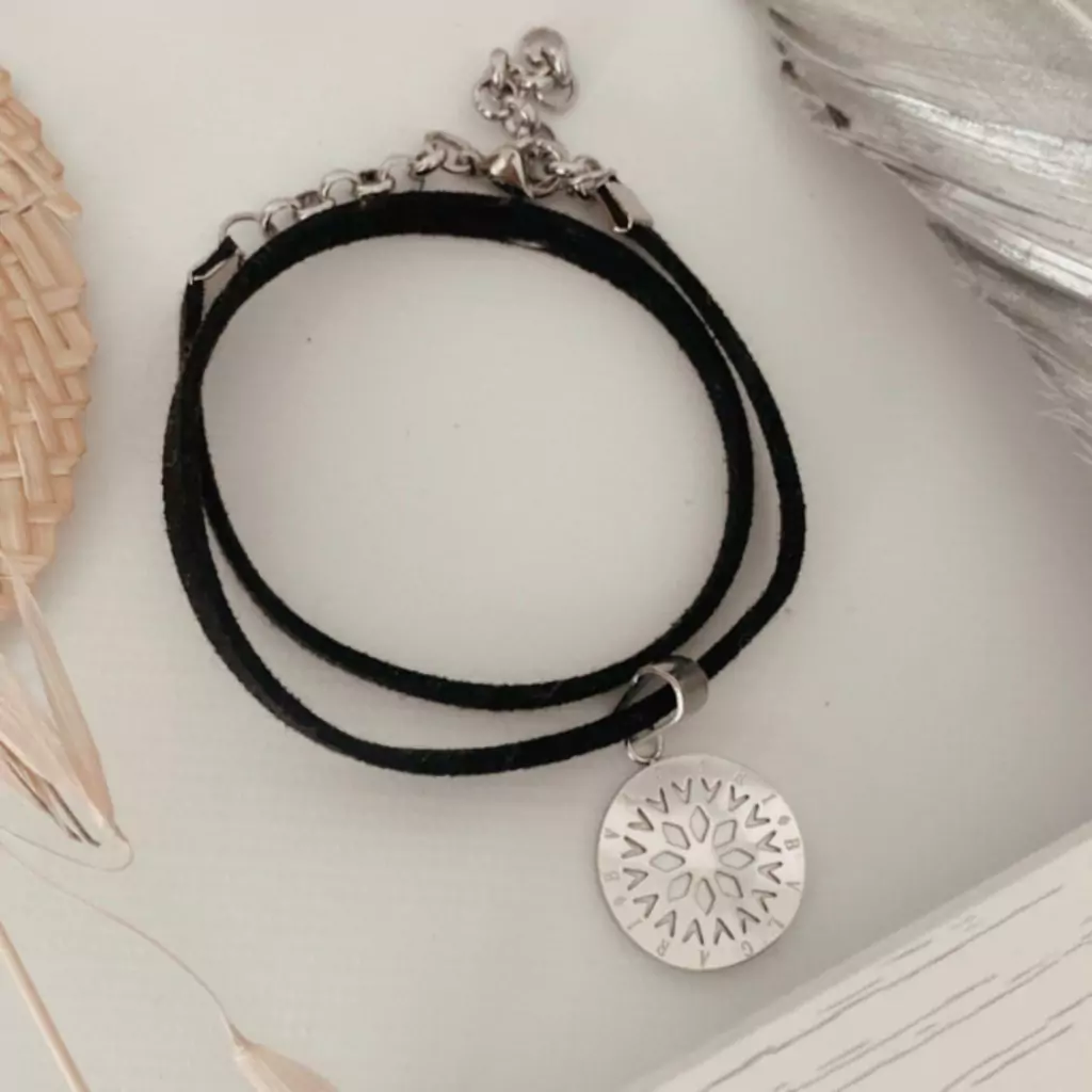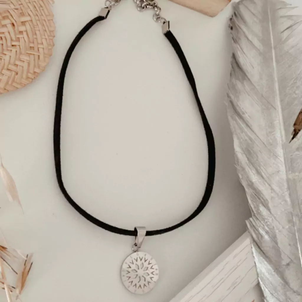 Hermoso choker de gamuza negra ancha con dije redondo con madala de acero quirúrgico inspirado en Bvlgari. En su interior tiene Nácar. Una belleza brillante que da luz al rostro de una manera íncreible. El alargue regulable y mosquetón son de acero quirúrgico.