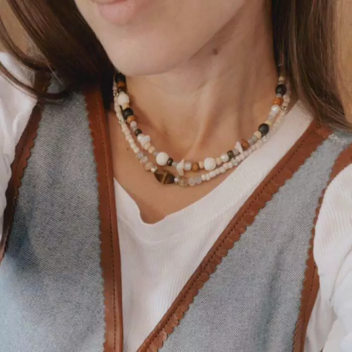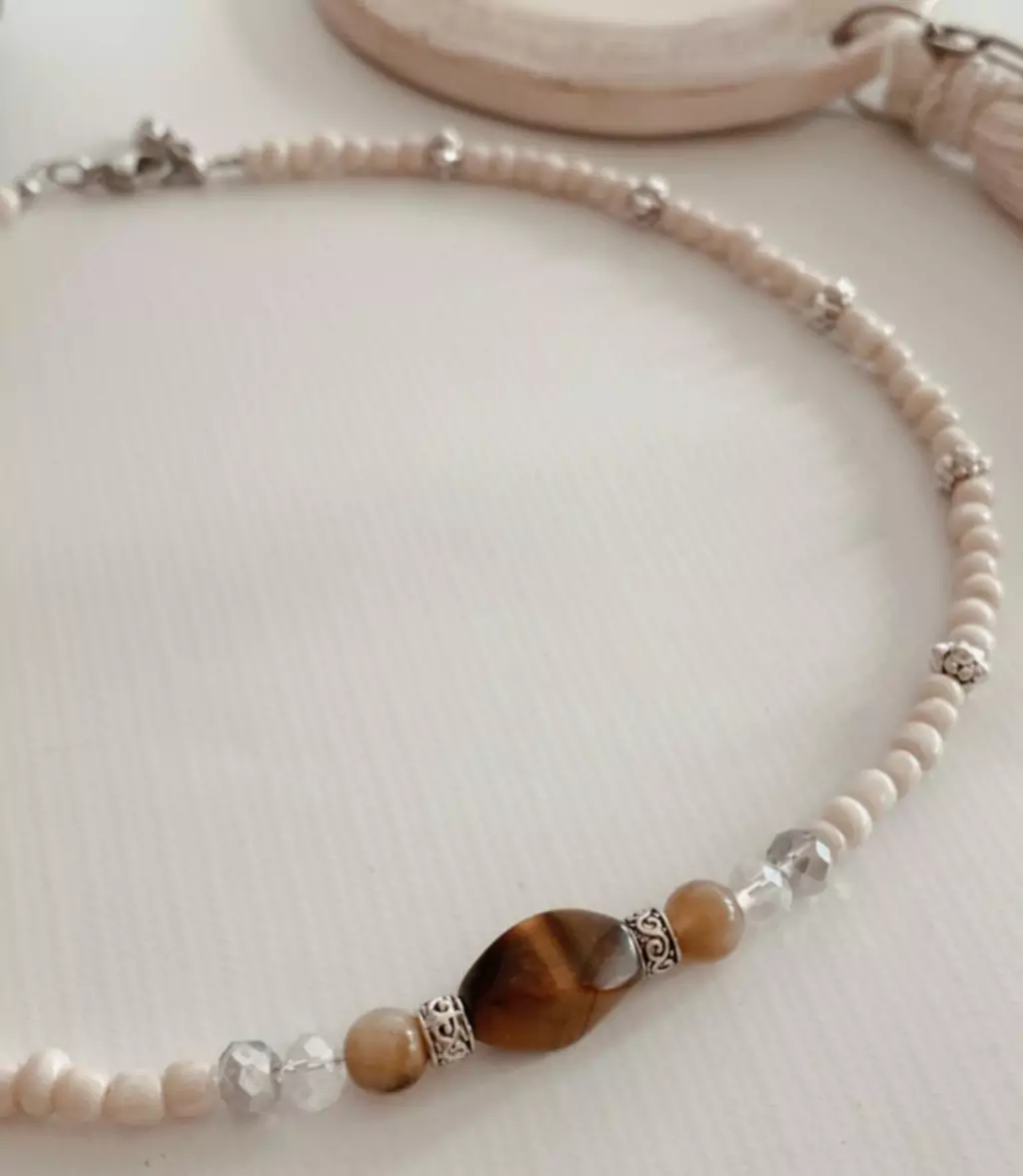Hermoso choker con ojo de trigre en forma cónica y dos rolados acompañandolo, es de mostacillones en crudo con intersecciones de pasadores de fundición y cristales facetador. Su terminación es con mosquetón y alargue de acero quirúrgico.