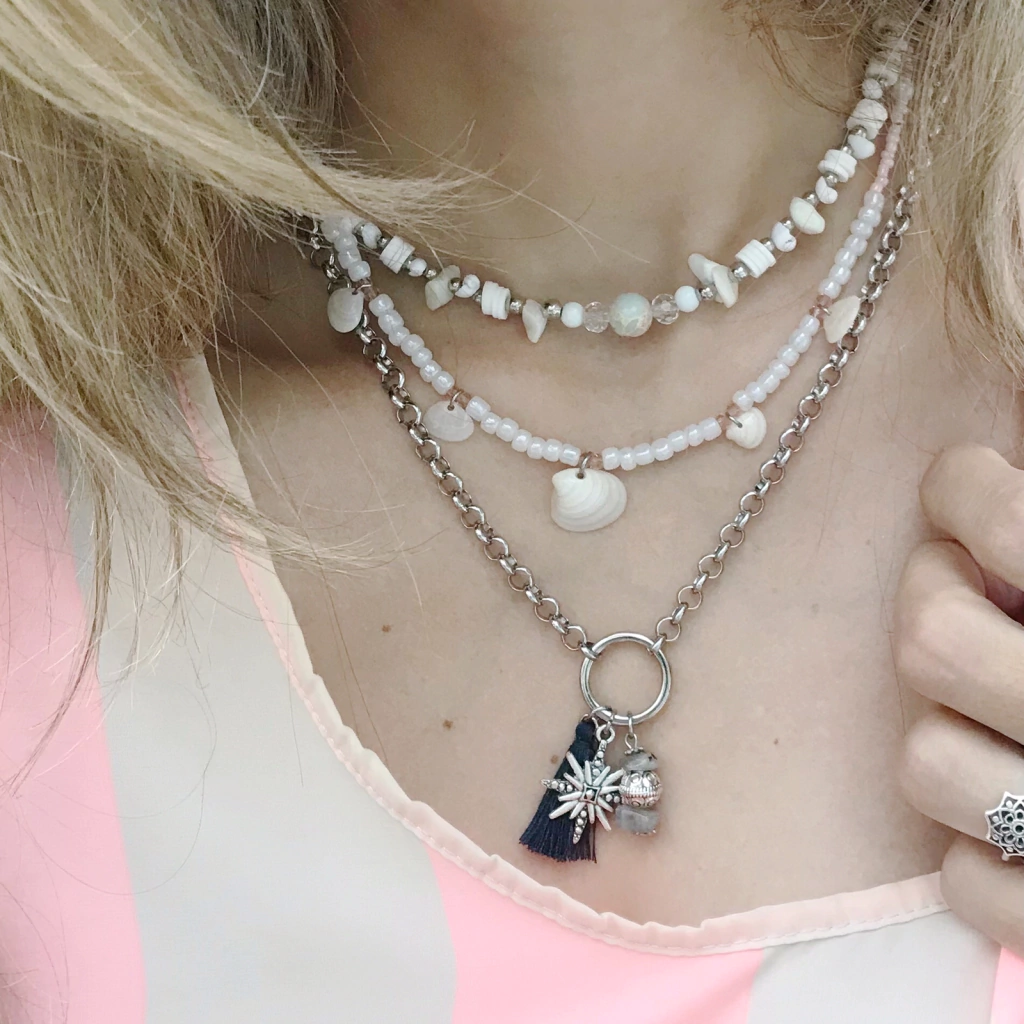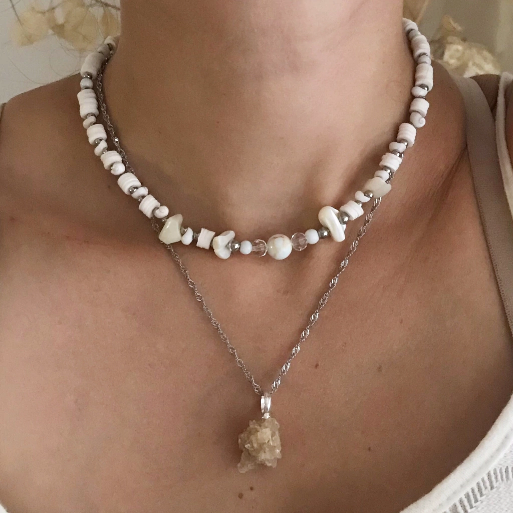 Hermoso collar blanco con mini caracolitos, nácar y en el centro el cristal Jaspe Imperial Turquesa. Además tiene gomitas de caucho, bolitas de acrílico e intersecciones de bolitas de fundición.