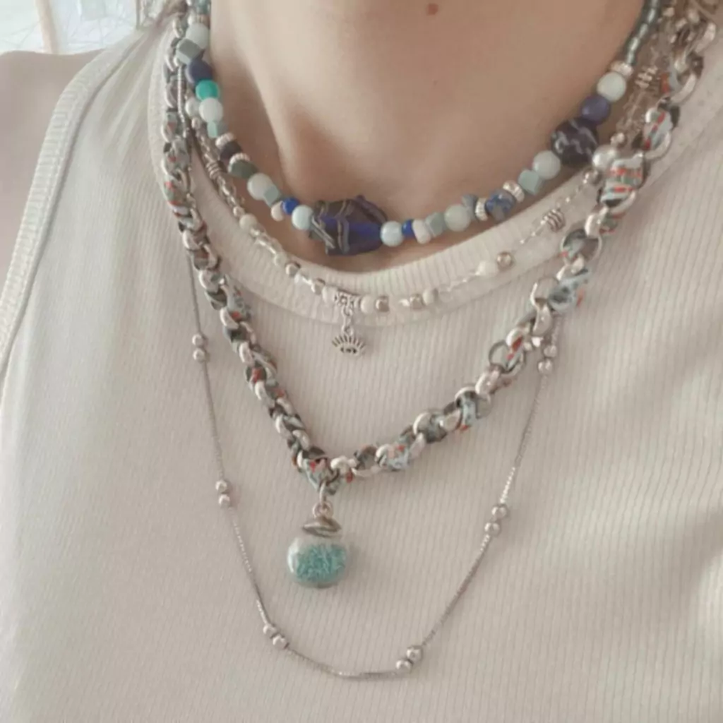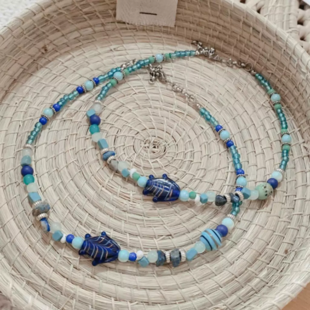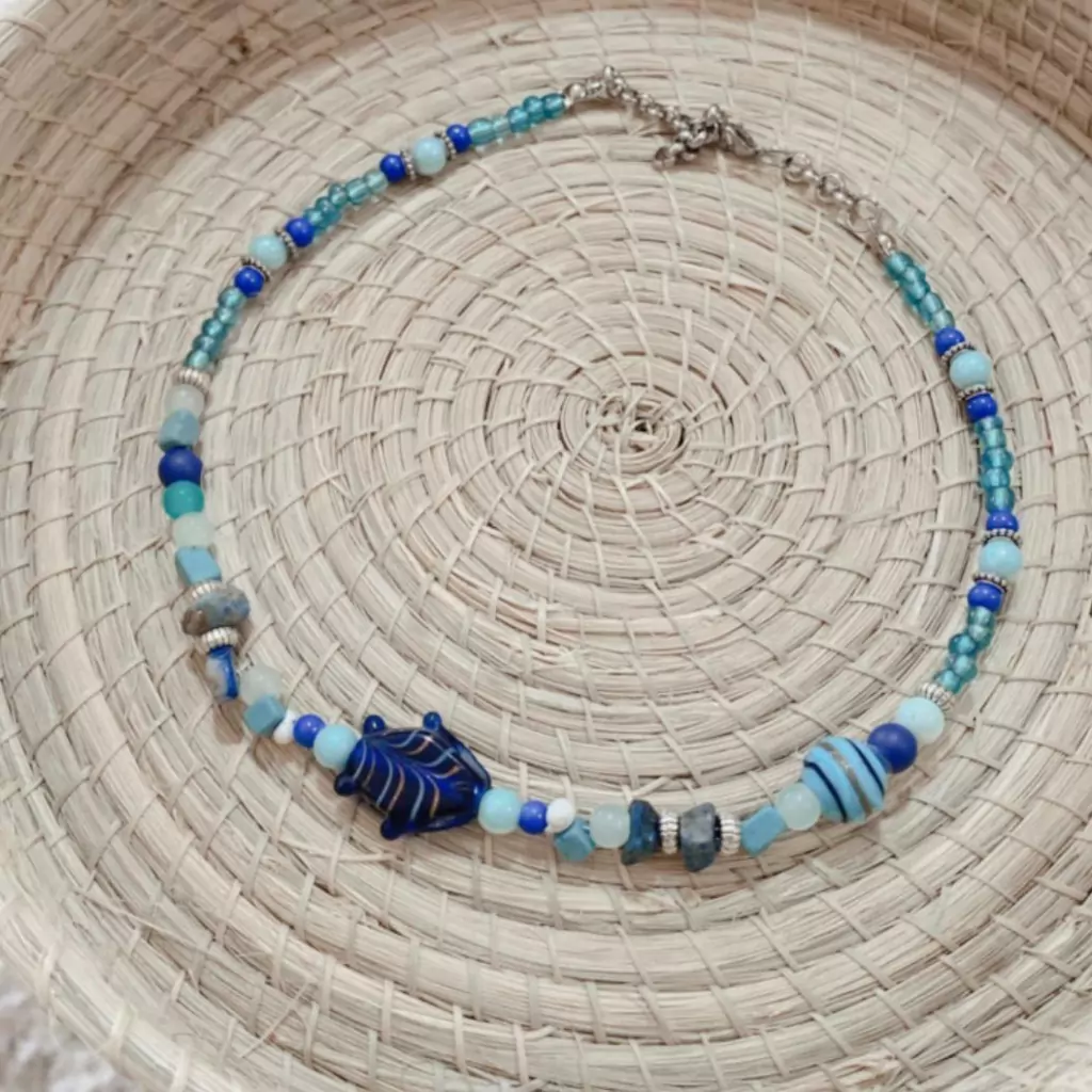 Hermoso choker con cuentas en tonos azules, verdes y aqcuas, pasador de pez, cristales de Lapislázuli y mucha magia. Tiene mosquetón y alargue regulable de acero quirúrgico.
