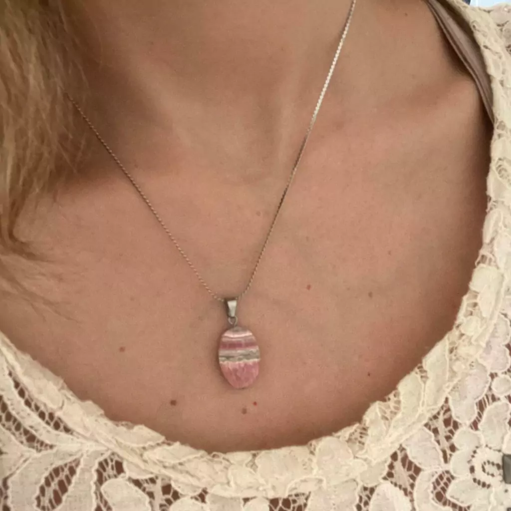 Hermoso no, Hermosísimo collar con cristal de Rodocrosita. Acompañado de una cadena preciosa de acero quirúrgico con un brillo insuperable.