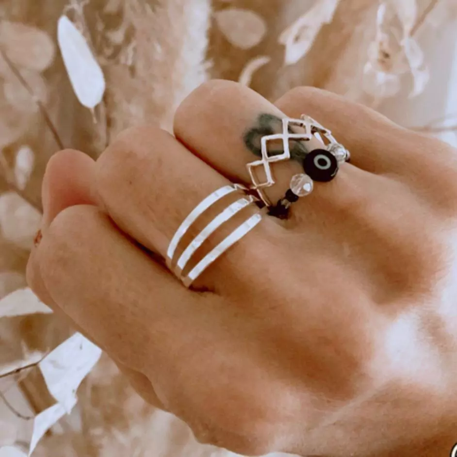 Hermoso anillo de acero blanco con rombos unidos, canchero y cómodo.