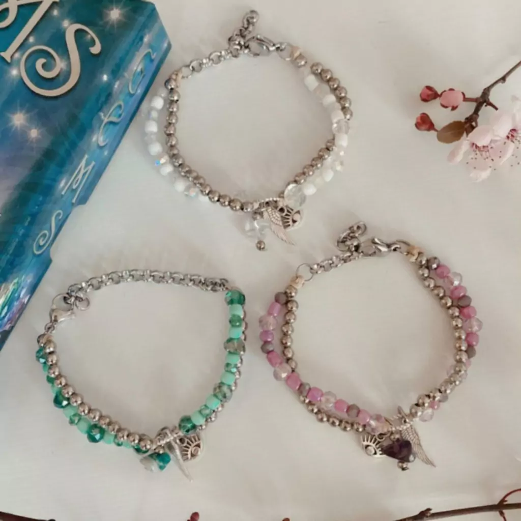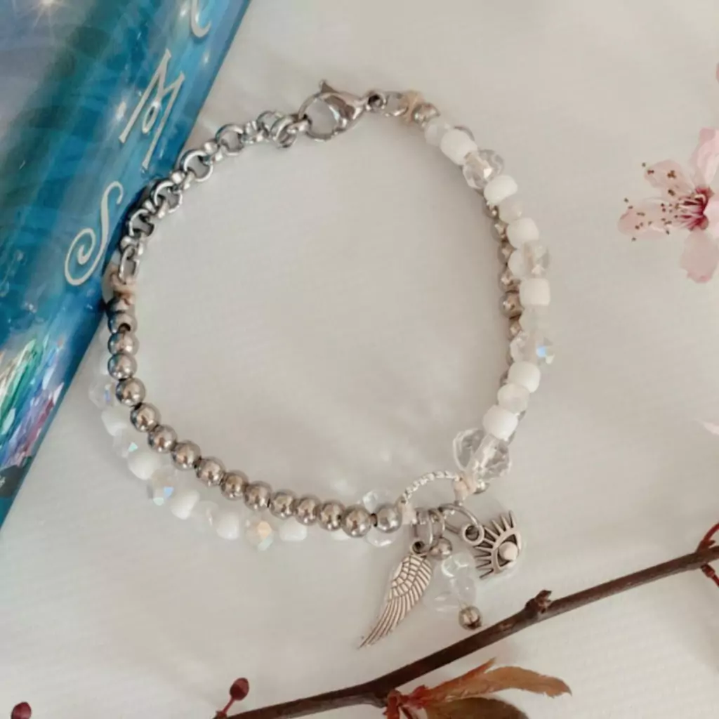 Hermosas pulseras dobles con bolitas, y cristales facetados combinados con mostacillones. En el centro tiene dijes de mini ojito protector, alita y cristal al tono. Tienen mosquetón y cadena reguale de acero quirúrgico. Una verdadera preciosidad.