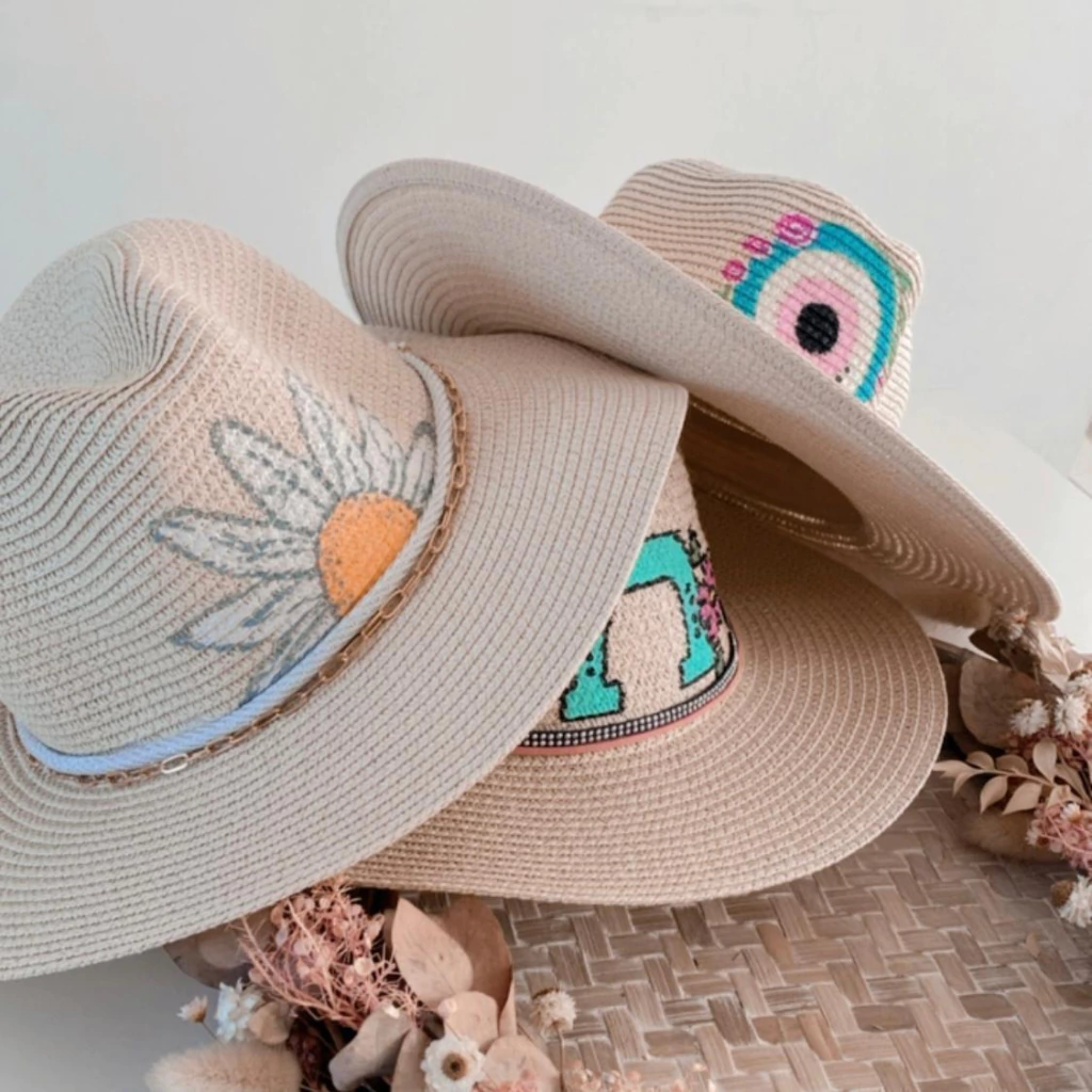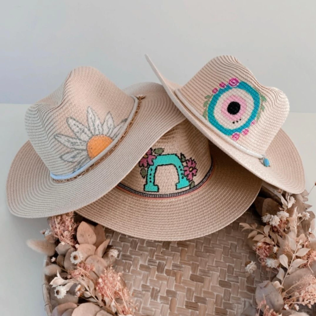 Hermoso sombrero de rafia blanda de excelente calidad. Es color crudo pintado una herradura y flores. Tiene cinto de gamuza rosa y azul oscuro con mini tachitas. Diseño de autor. Una verdadera belleza.