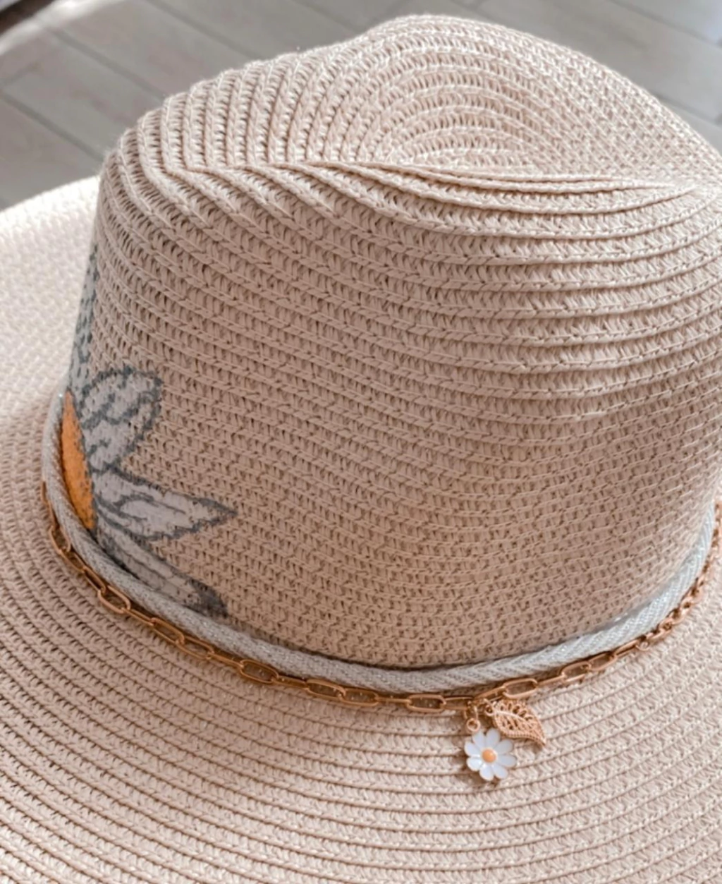 Hermoso sombrero de rafia blanda de excelente calidad. Es color crudo pintado a mano de media margarita y detalles de dijes de margarita dorada y hoja. Su cinto es de hilo de algodón con brillos en crudo combinado con cadena dorada. Diseño de autor. Una verdadera belleza.