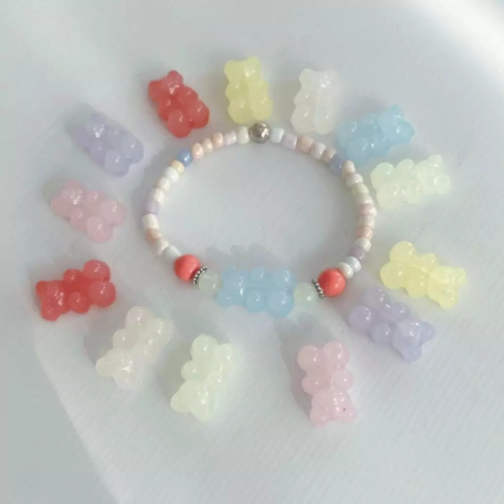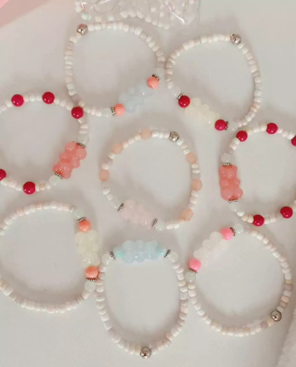 Hermosas pulseras elásticas con dije de yummy en tonos pasteles, con bolitas que brillan en la oscuridad y bolitas en tonos tambien pasteles que acompañan el dije principal. Con algunas cuentas que resaltan y le dan más vida y diversión a estas pulseras del amor.