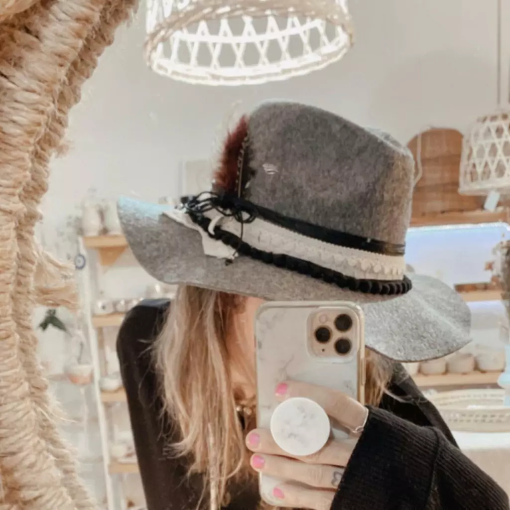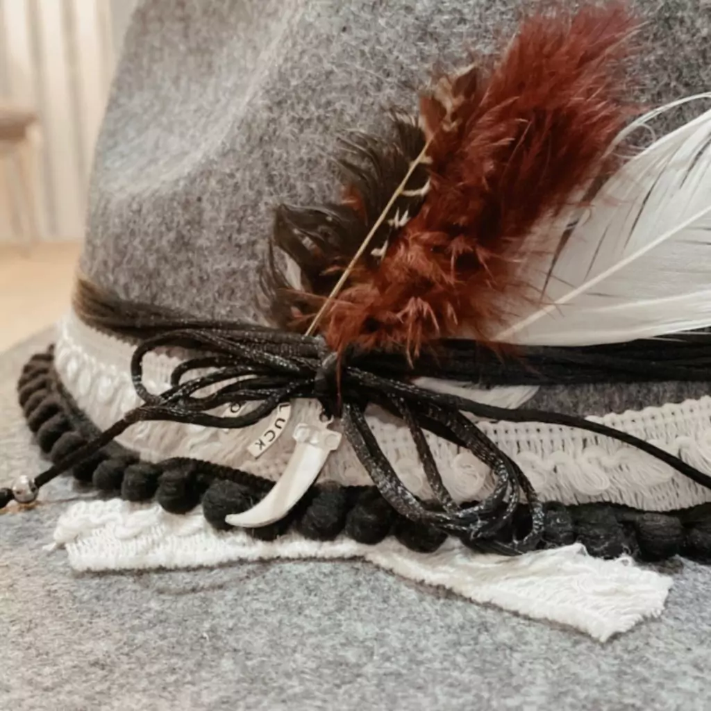 Sombrero de Fieltro y paño gris jaspeado con cinto de algodón en crudo, pompones el crudo, lazo de razo, plumas de diferentes tonos y dije de herradura y colmillo laqueado.