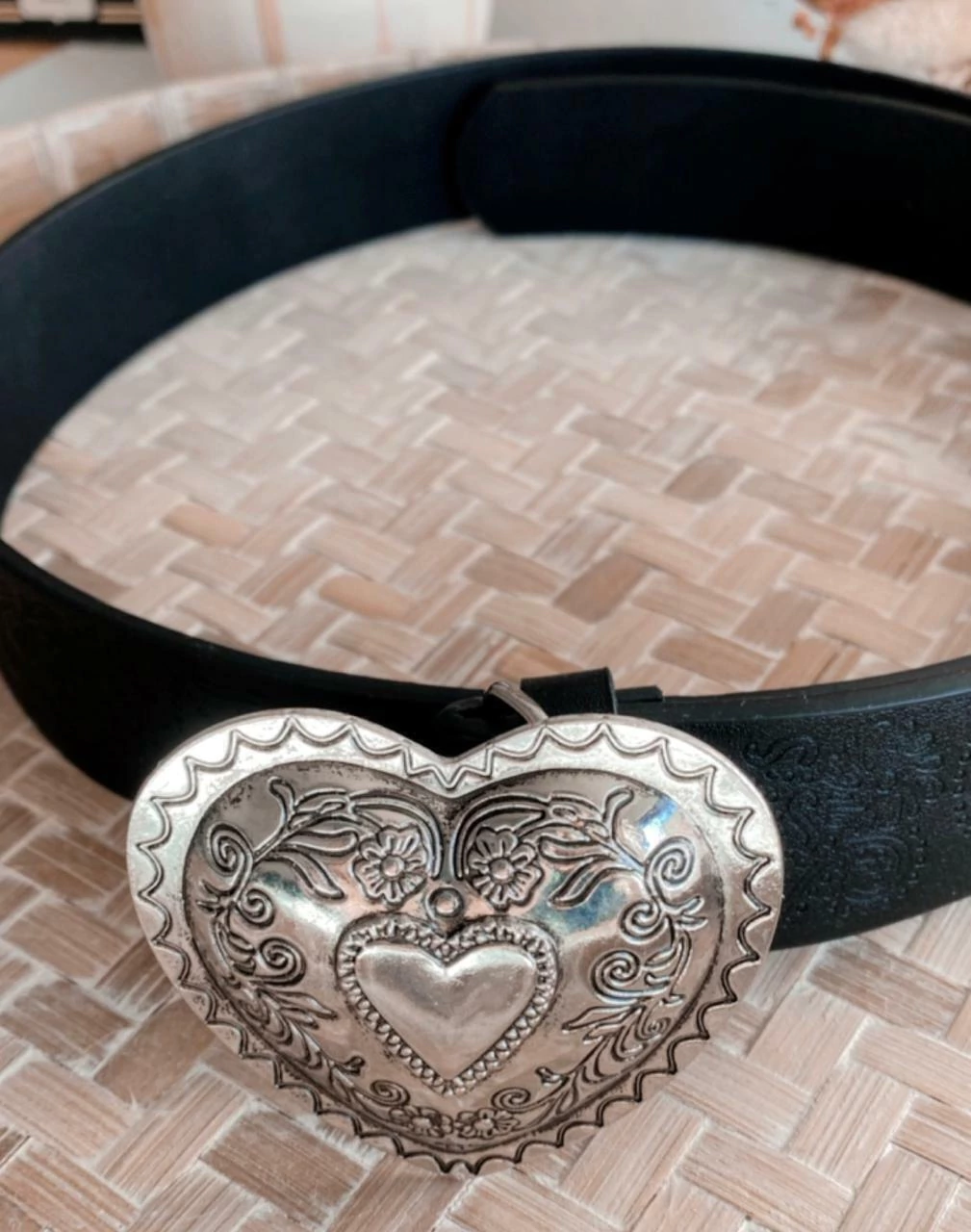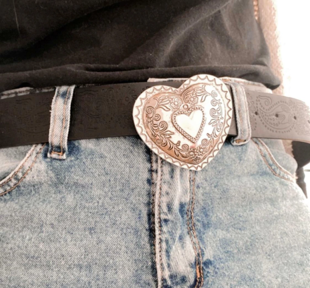 Hermoso cinto de PU con hebilla plateada de corazón labreado y reforzado. Todo el cinto esta trabajado con detalles y dibujos increibles siguiendo el lineamiento de la hebilla, una preciosura! Es de excelente calidad.