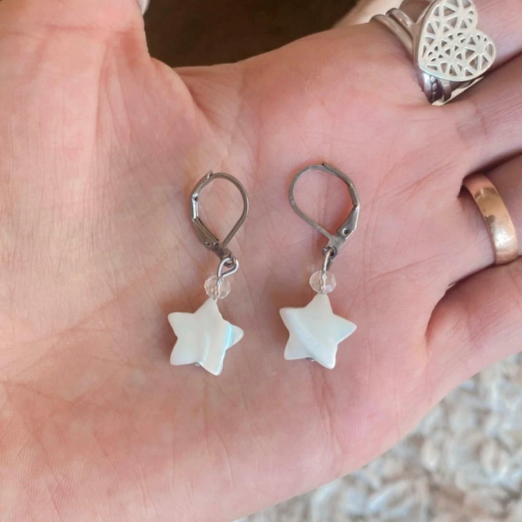 Hermosos aros con dije de estrella de nácar, llenos de vida, cómodos, ideales para todos los días. Llenos de verano y hermosura.
