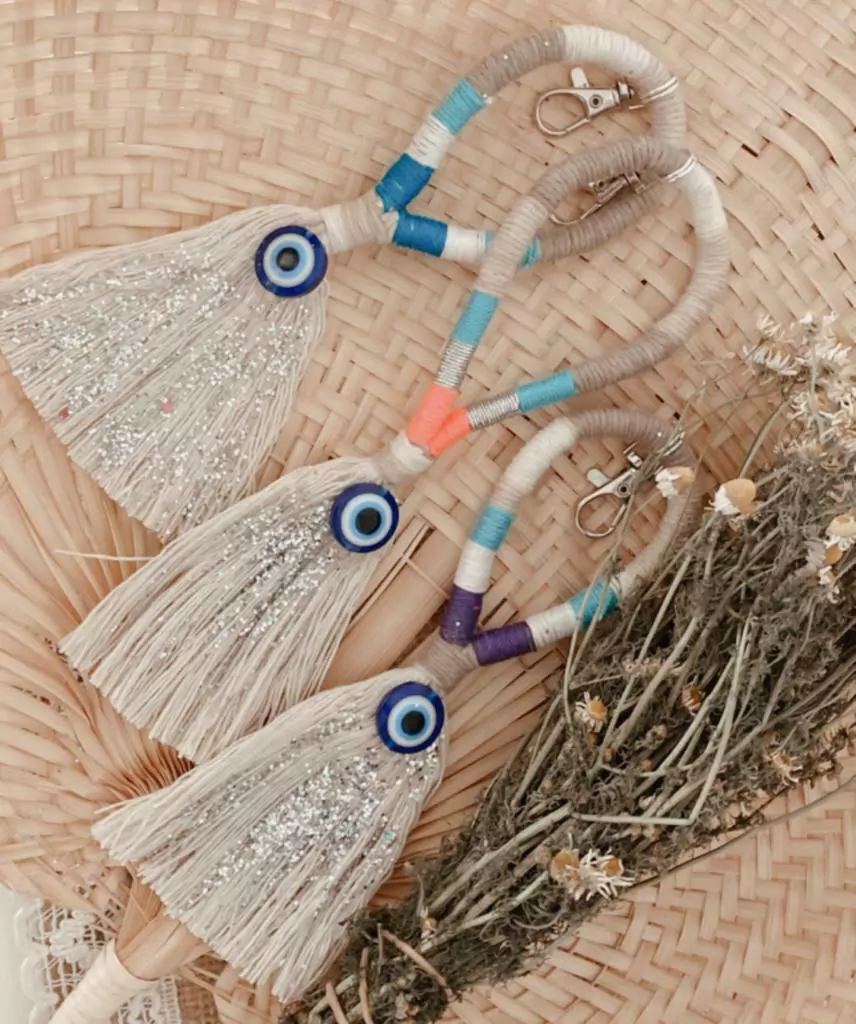 Hermoso llavero y amuleto protector con ojo de acrílico, hilos de algodón natural con brillos y lanas de colores. Además cuenta con mosquetón de metal para usar como llavero. Ideal para colgar en tu casa, auto o lugar de trabajo para proteger y llenar de energía elevada el lugar.
